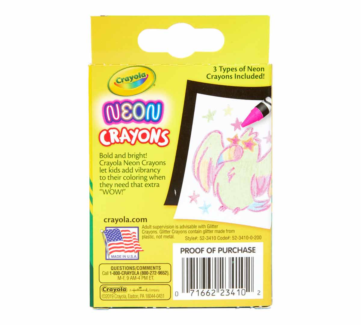 Shockingly bold and bright—Crayola Neon Crayons add vibrancy to your coloring designs or art projects when you need that extra "WOW" factor. Great on light or dark paper.