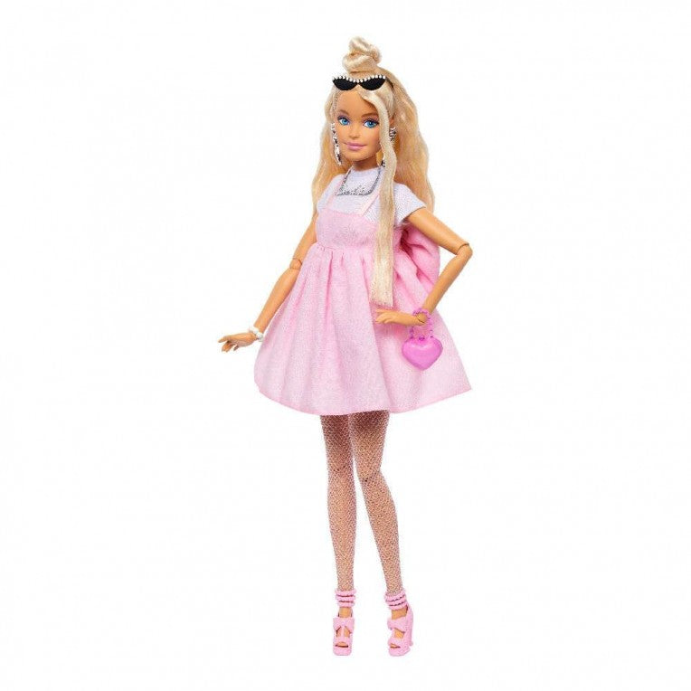 - Barbie doll pairs her outfit with statement jewelry, pearly sunglasses, a heart-shaped purse, and strappy bow shoes. Bendable joints allow her to strike all sorts of poses.