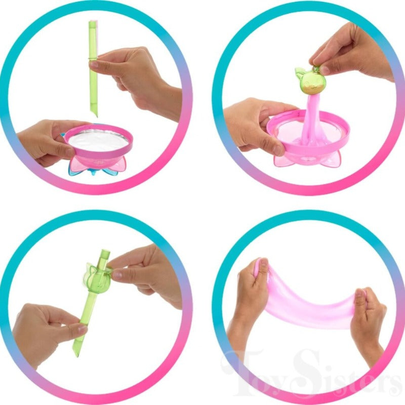 - Unscrew the animal ear lid with the shimmery Slime and use the straw to poke through the film to discover squishy fun.