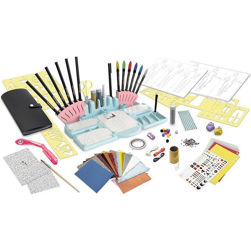 Turn on the lamp, choose a body silhouette, draw the outfit with the stencils and create volume by using the extensive accessories included