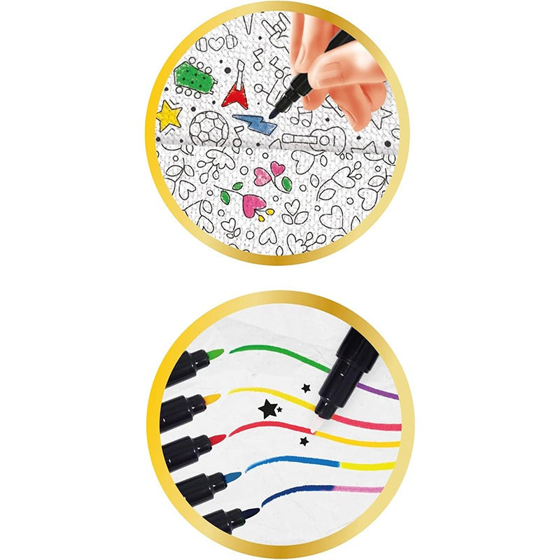 Includes numerous accessories: magic markers, adhesives for coloring, watercolor pencils, LED lamp, 2 punches, rhinestones, ribbons.