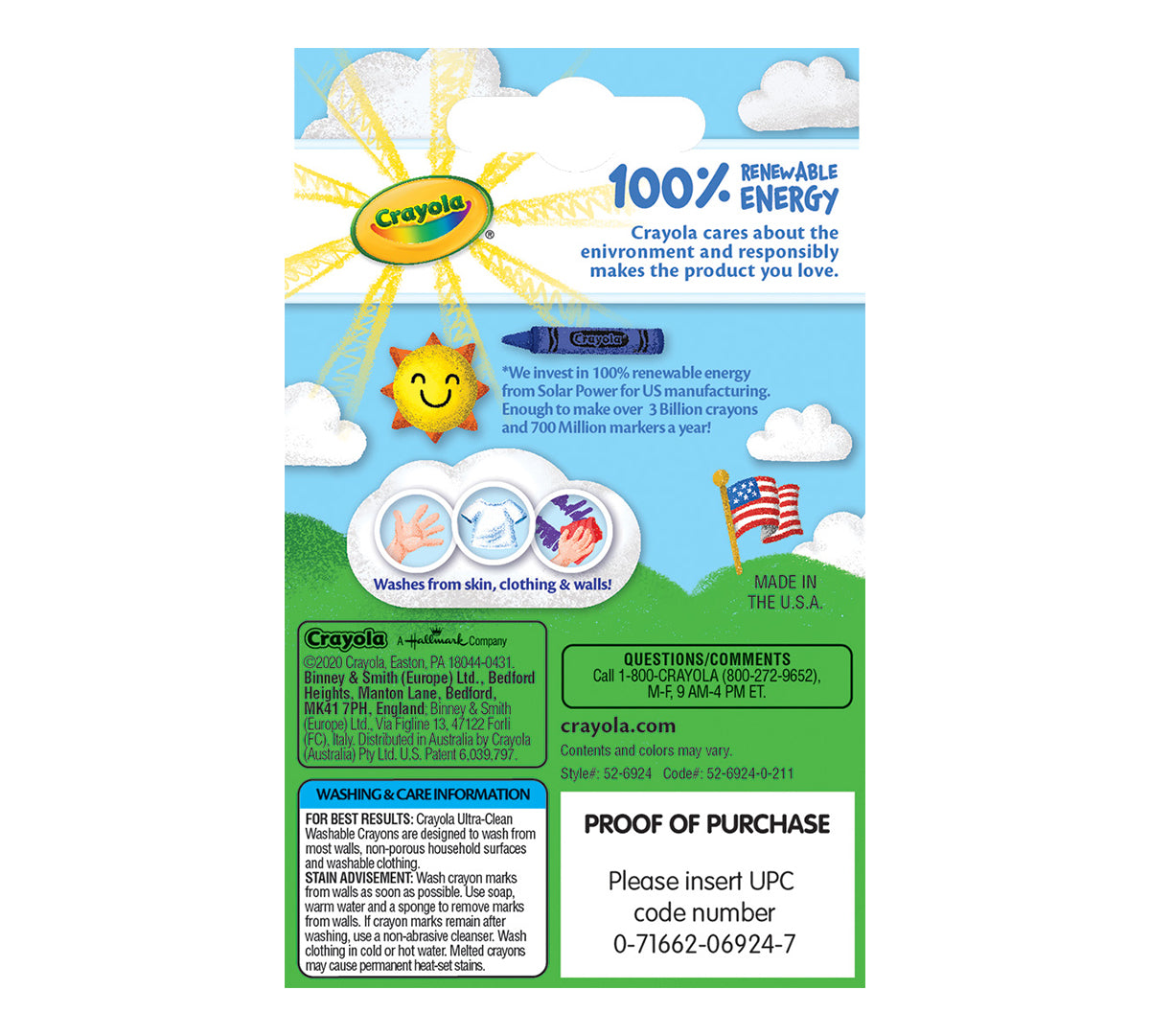 Give your little artist all the tools they need to explore their imagination with Crayola Ultra-Clean Washable Crayons. Nontoxic and washable, these kid-friendly crayons come with 24 fun, bright colors your little one will love using whether they're coloring in the lines of a coloring book or creating something on their own from scratch. Great for use at home or school, washable crayons are an essential creative tool for kids. The Crayola Crayons in this pack are nontoxic and specially formulated to wash clean from skin, most washable clothing, and most painted walls. Pair with a Crayola coloring book (sold separately) for a great gift for kids. Ideal for children ages 3 and up.