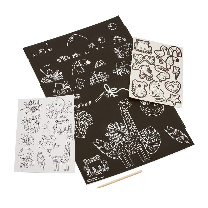 - Comes in 20 pieces, 6 shapes, 1 scraper, 6 A4 velvet sheets, 2 color your own stickers, 6 A4 scratch sheets.