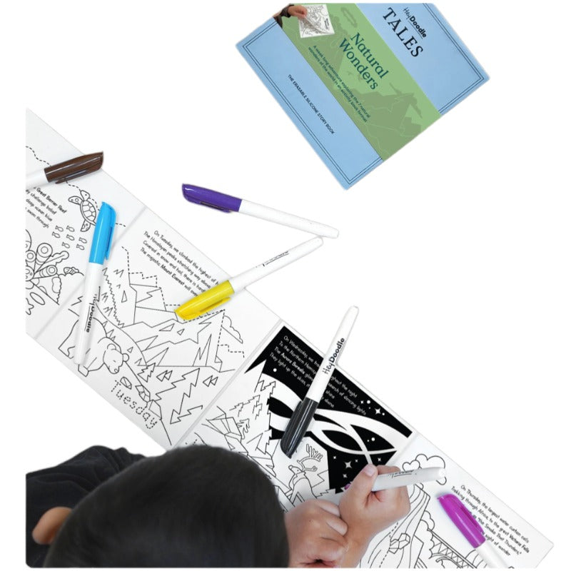 - Package includes 1 foldable storybook (consisting of 8 reusable coloring pages), 12 markers, 1 keepsake box.