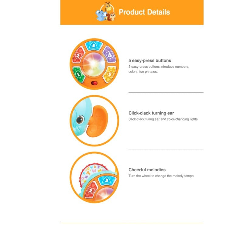 5 easy-press buttons introduce numbers, colors, and fun phrases.